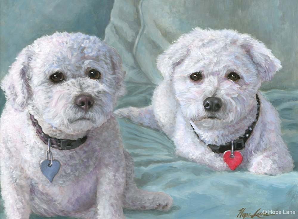 Chloe and Tess, custom pet portraits of Two Bichon Frises by Hope Lane