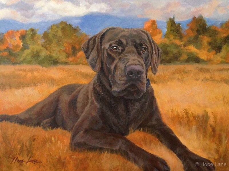 Bear, custom pet portrait of a Chocolate Labrador Retriever by Hope Lane