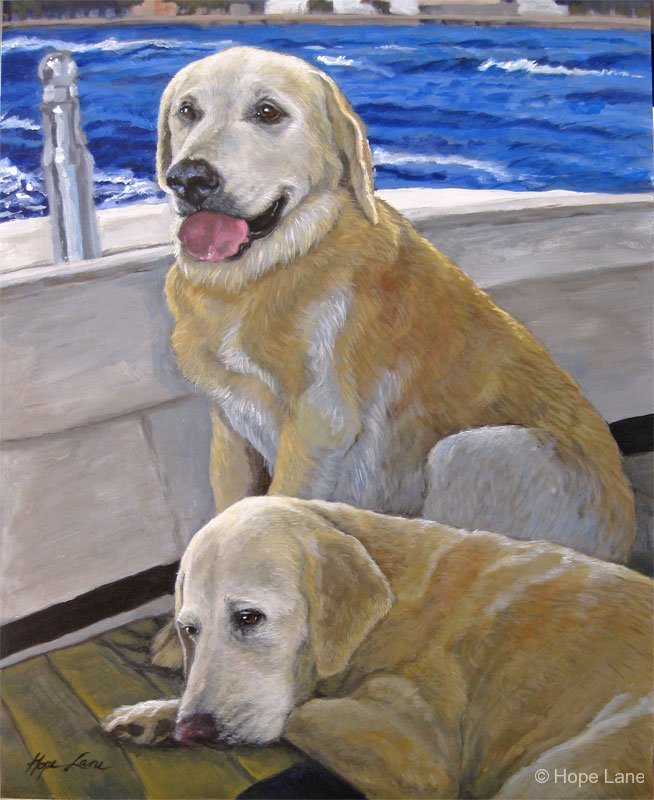 Bailey and Rocky, custom pet portraits of two yellow labs by Hope Lane