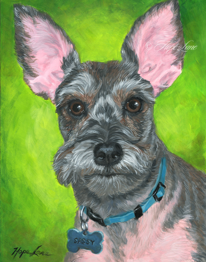 Sassy the Schnauzer custom pet portrait painting by Hope Lane